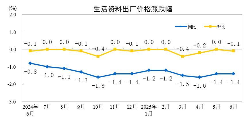 6月份,工业生产者出厂价格中,生产资料价格下降0.6%,影响工业生产者出厂价格总水平下降约0.42个百分点。其中,采掘工业价格下降1.2%,原材料工业价格下降0.7%,加工工业价格下降0.5%。生活资料价格下降0.1%,影响工业生产者出厂价格总水平下降约0.02个百分点。其中,食品价格下降0.3%,衣着价格持平,一般日用品价格上涨0.1%,耐用消费品价格下降0.1%。