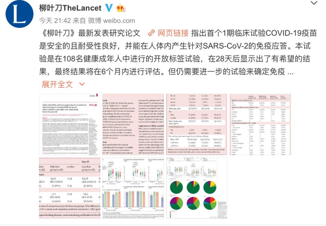 全球医学界顶级论文期刊《柳叶刀》发表来自中国工程院院士陈薇团队的最新论文,称全球首个重组腺病毒5型载体新冠疫苗I期临床试验结果显示,在给志愿者接种后28天时,显示出免疫原性和人体耐受性。