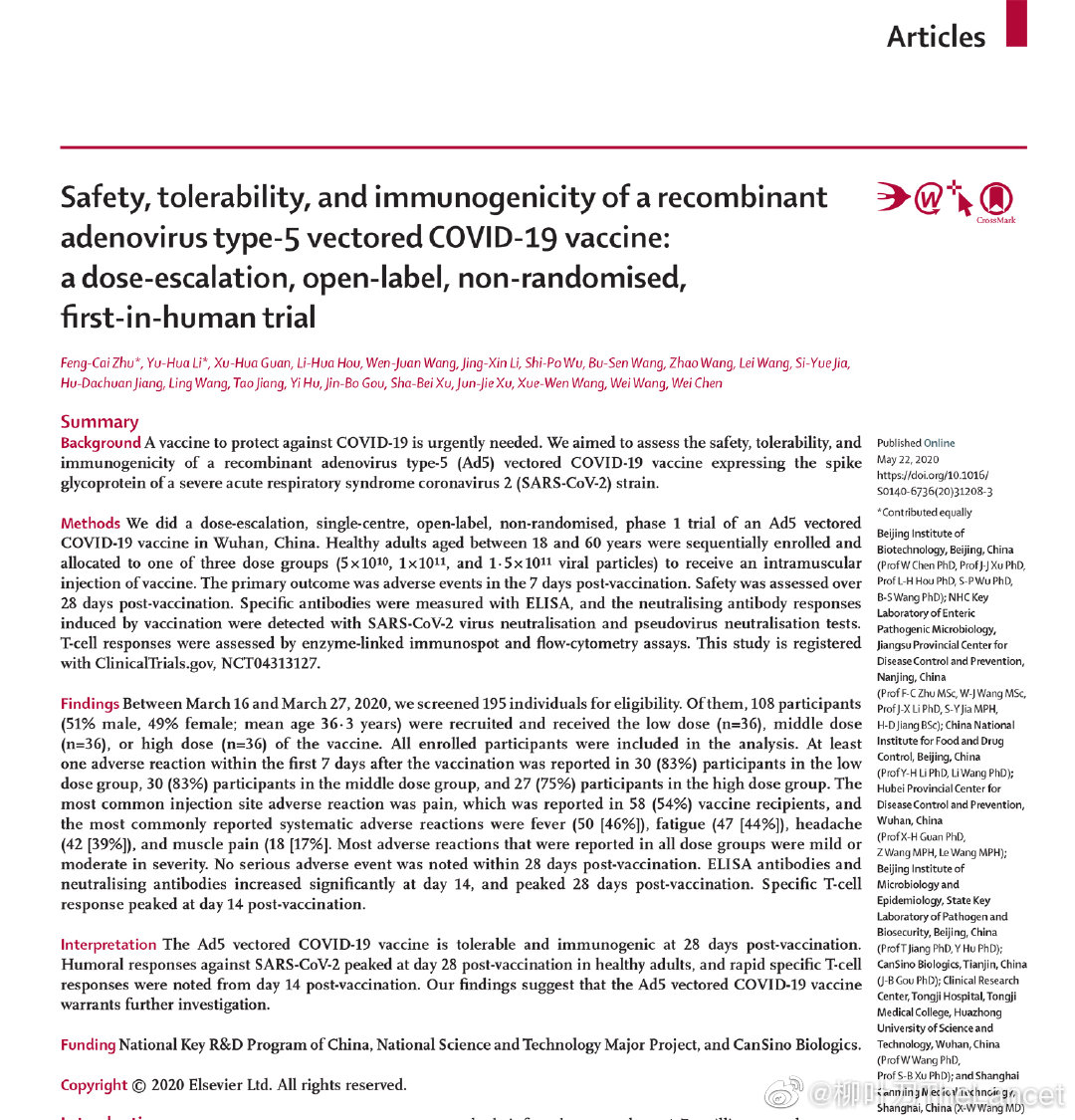 5月22日晚,国际学术期刊《柳叶刀》在线发表全球首个重组腺病毒5型载体新冠疫苗I期临床试验结果,研究显示,前述以腺病毒Ad5为载体的新冠疫苗,在给志愿者接种后28天时,显示出免疫原性和人体耐受性。在健康成年人中,对SARS-CoV-2的体液免疫反应,在接种疫苗后第28天达到峰值;快速的特异性T细胞反应,从接种疫苗后的第14天开始有记录。