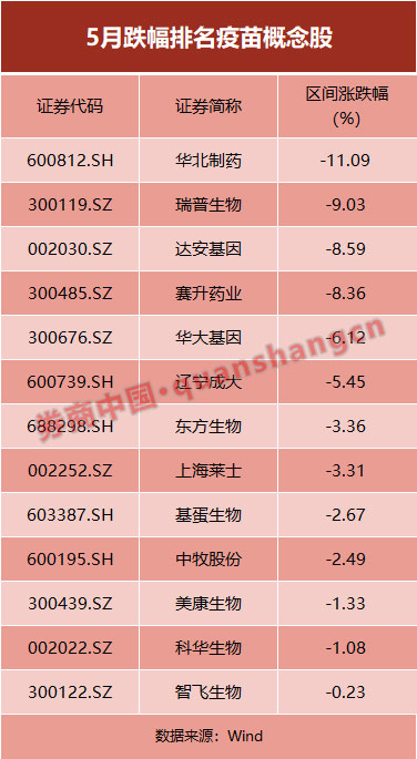 进入5月以来,部分生物疫苗概念股出现调整。比如华北制药跌11%、瑞普生物跌9%,达安基因和赛升药业均跌8%以上。