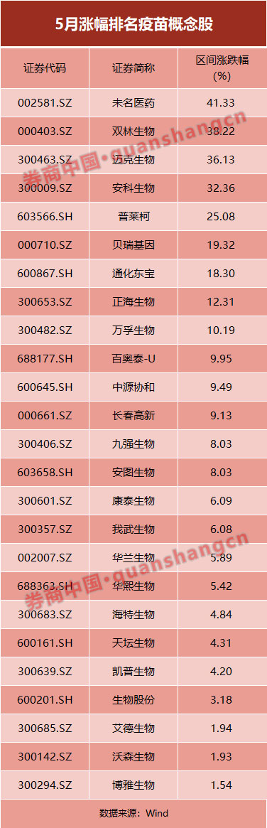 共有9只概念股5月至今涨幅超10%以上,其中未名医药涨势最好,涨幅达到41%;双林生物、迈克生物、安科生物均涨逾30%。