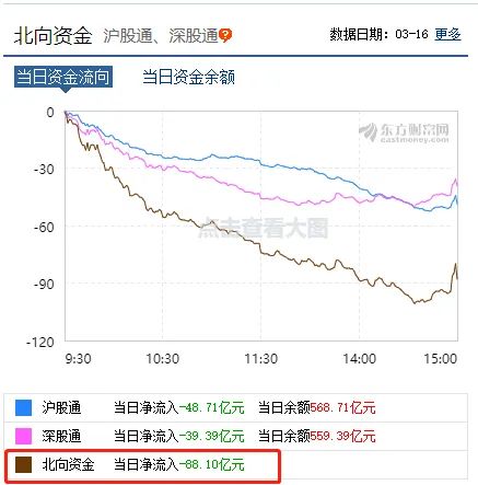 今日市场大跌,北上资金是卖出的重要力量,净流出88亿元,其中沪股通当日净流入-48.71亿元,深股通当日净流入-39.39亿元。