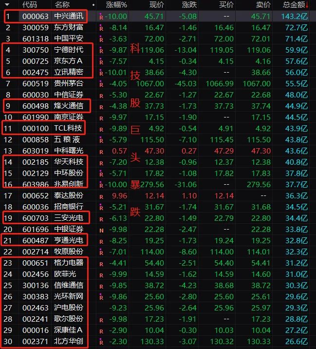 科技股巨头纷纷跌停。中兴通讯跌停、立讯精密跌停、宁德时代逼近跌停,隆基股份跌停,歌尔股份跌停。具体来看,中兴通讯受美国调查传言影响,宁德时代遭遇股东抛售消息影响。中兴通讯今日成交额143亿元,宁德时代成交额60亿元。