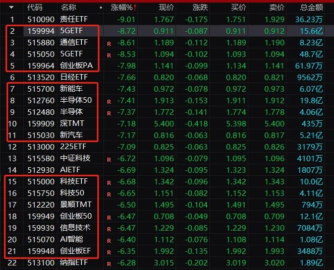 受科技股暴跌影响,前期热门的科技股ETF也遭遇重挫。5GETF、通信ETF暴跌近9%,新能车ETF、半导体ETF、半导体50ETF、新汽车ETF跌逾7%,科技ETF等跌逾6%。