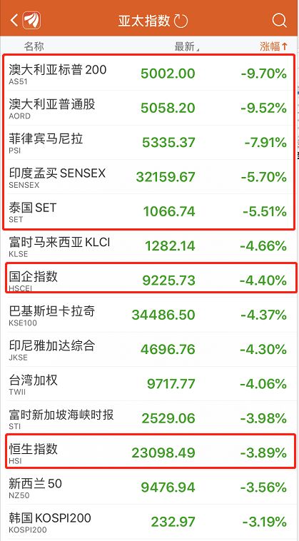 今日,全球市场又是腥风血雨,交易的亚太股市全面重挫,A股上证指数大跌3.4%,港股恒生指数跌4%(15:20),澳大利亚暴跌9.7%,菲律宾、印度、泰国跌逾5%,韩国跌逾3%,日本收跌2.46%。