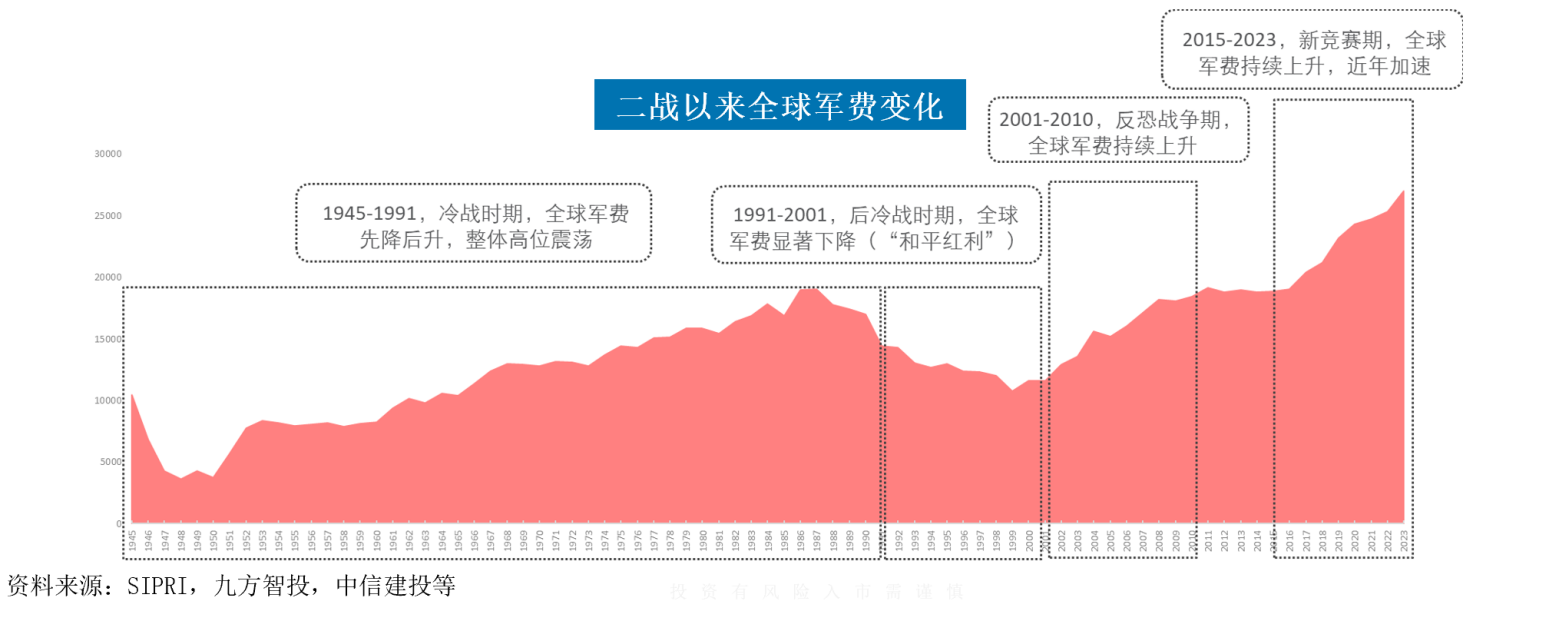 2026年是“十五五”规划的开局之年。俄乌、印巴、巴以等热点冲突凸显全球安全格局的动荡,推动各国军费开支持续攀升。2024年全球军费总额达2.72万亿美元,创下冷战以来最大增幅(同比+9.4%)。美国2026财年国防预算提案高达1.01万亿美元,明确聚焦于大国竞争。