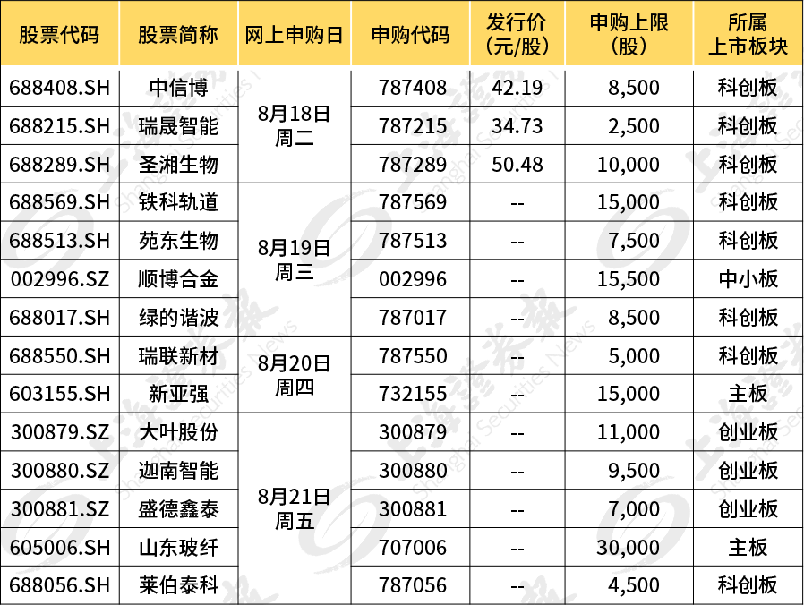 根据目前安排,若无变化,下周(8月17日至21日)将有14只新股可申购,包括8只科创板新股,1只中小板新股,两只沪市主板新股及3只创业板新股。
