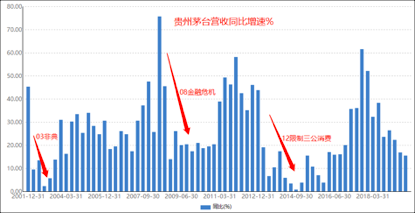 2012年限制三公消费,影响在2013年逐渐开始显现。贵州茅台2013年上半年的营收和归母利润增速分别从2012年的43.76%、51.86%骤降至6.58%、3.61%,公司股价从2013年1月初的206.94元下跌至12月底的122.5元,下跌幅度达到38.58%。尽管下半年有所恢复,但受到后续行业塑化剂黑天鹅事件的影响,直到2016年行业才全面复苏。
