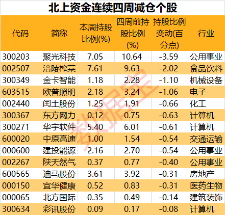 数据宝统计显示,北上资金连续四周卖出 14股。行业来看,公用事业、计算机股数量居多,均有3只。从持股比例变动情况来看,与四周前相比,4股减仓超1个百分点。聚光科技、涪陵榨菜位居减仓前两名,2股持股比例下降幅度均超过2个百分点。其中聚光科技遭减仓最为显著,达到3.59个百分点。