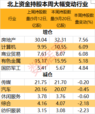 本周北上资金持股数量环比增加行业有22个。从净流入行业来看,房地产、计算机、商业贸易及有色金属4行业持股数量环比增加5%以上。其中,房地产行业获加仓最为明显,北上资金本周持有该行业股票32.31亿股,环比增加7.56%。