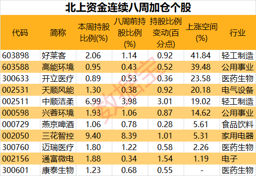 从市场表现来看,连续8周获增仓的11股中,通富微电股价本周股价大幅上涨5.22%,迈瑞医疗股价也上涨3.83%,而中顺洁柔股价本周股价大幅下跌4.12%。北上资金连续加仓股往往代表其看好未来的升值空间。上述11股除康泰生物外,其余10股均具备不同幅度上涨空间。其中,好莱客、高能环境、开立医疗及天顺风能4股上涨空间超20%,前2股上涨空间均为40%左右。另外,中顺洁柔上涨空间也高达19.02%。(数据宝 张娟娟)