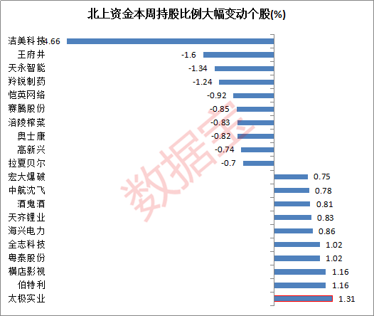 从北上资金减持股来看,洁美科技遭减仓最为显著,持股比例下降4.66个百分点,该股本周股价下降3.82%,其次的王府井持股比例下降1.6个百分点。另外,天永智能、羚锐制药及恺英网络持股比例下降幅度均超过0.92个百分点。