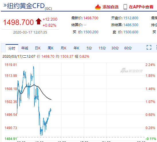 3月16日盘中,金价一度较日高大跌逾120美元,跌破1500美元/盎司,触及1451.1美元/盎司低点,跌幅达5.1%。不过美市盘中金价一度自低位反弹近70美元,缩减了跌幅。截至北京时间3月17日12时,纽金报1498美元/盎司。