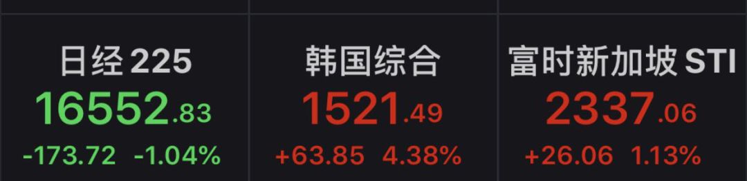 亚洲其他市场风险偏好也有所提升。截至记者发稿时,恒生指数上涨2.75%,韩国综合指数上涨4.33%,富时新加坡STI上涨1.21%,日经225下跌1.04%。