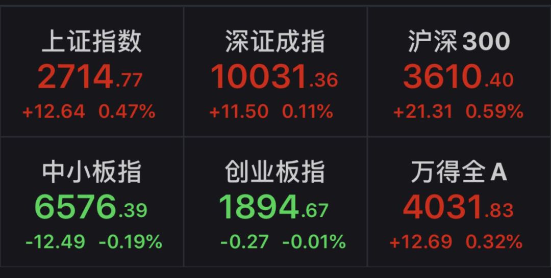 Wind数据显示,截至午间收盘,上证指数上涨0.47%,报2714.77点;深证成指上涨0.11%,报10031.36点;创业板指下跌0.01%,报1894.67点。