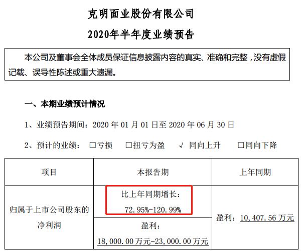 依靠主营发力的还有克明面业(002661)。综合来看,在去年上半年1.04亿元净利润的基础上,公司今年上半年依旧有望实现72.95%-120.99%的净利润增长。