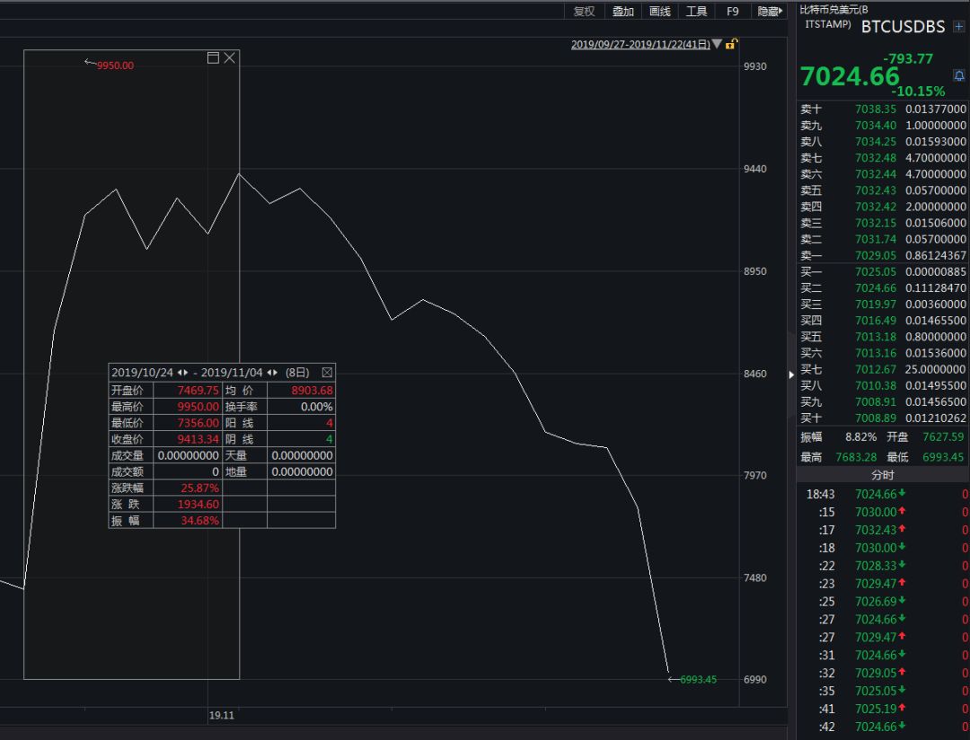 数据显示,10月24日至11月4日之间,比特币最低从7356美元涨至9950美元,最高涨超35%。