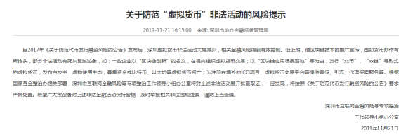 11月21日,深圳市互联网金融风险等专项整治工作领导小组办公室发布关于防范“虚拟货币”非法活动的风险提示。虚拟货币炒作将纳入深圳地方金融监管重点。