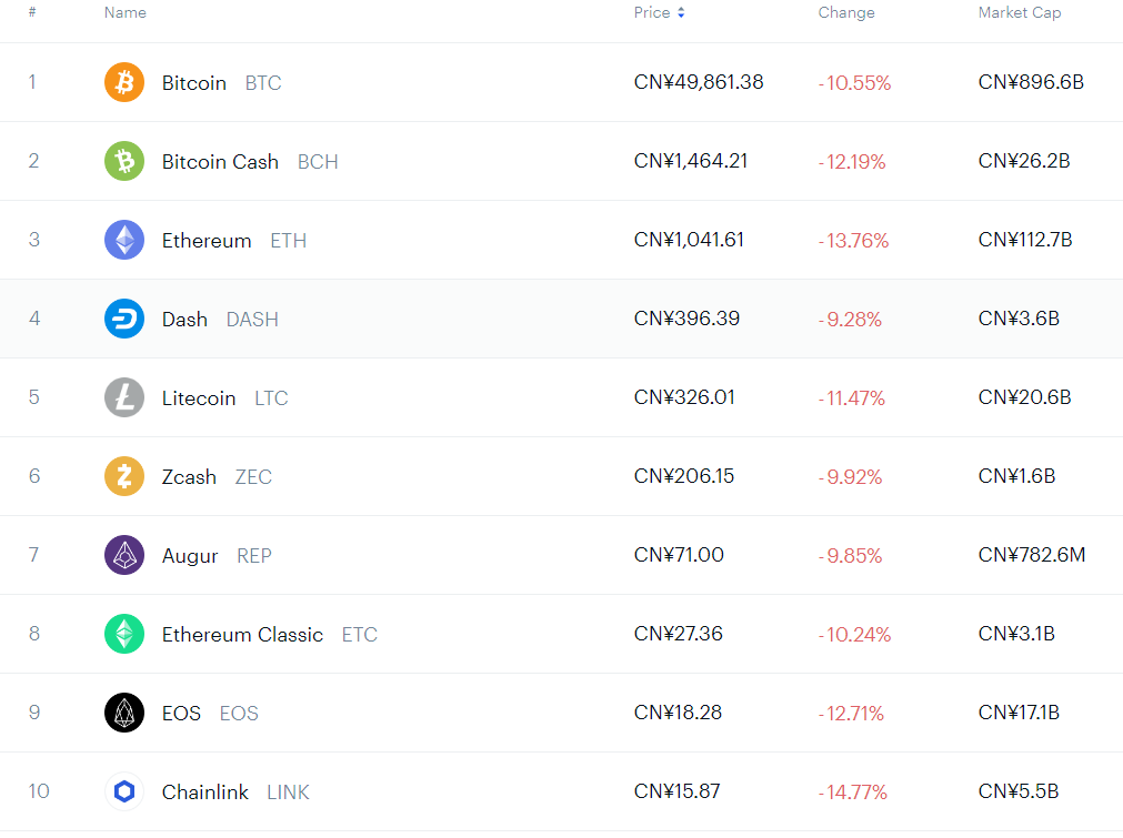 同时,按市值排名前十的其他加密货币也都下挫,跌幅在9%以上。