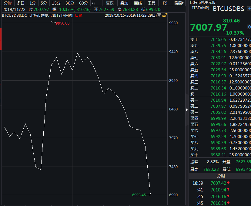 北京时间22日17:55左右,比特币突然下挫,直接从7500美元下跌至7000美元,短线下跌逾400美元,截至记者发稿,比特币跌至7007美元,一度跌破7000关口。