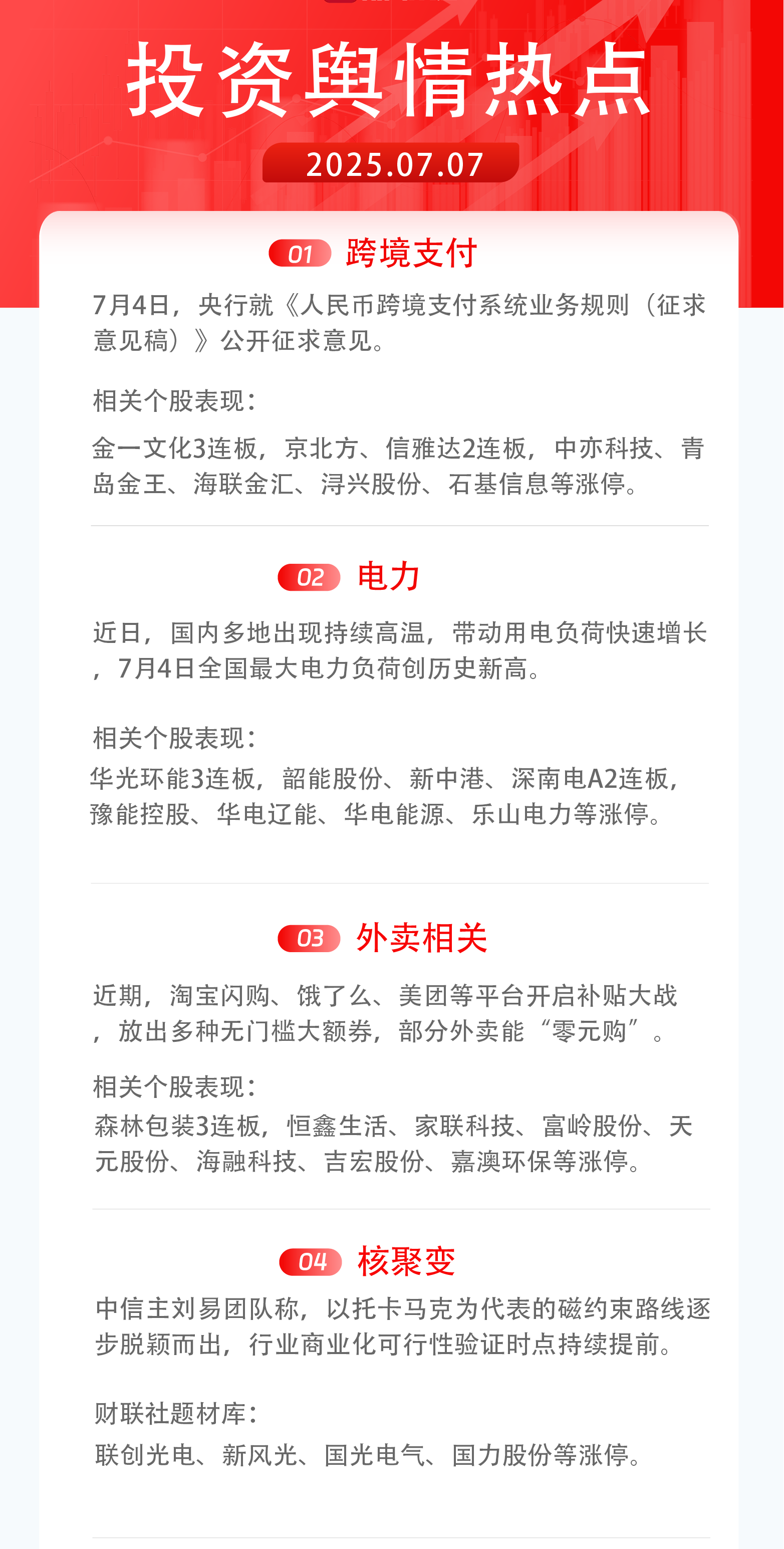 7月7日舆情热点:跨境支付、电力、外卖相关