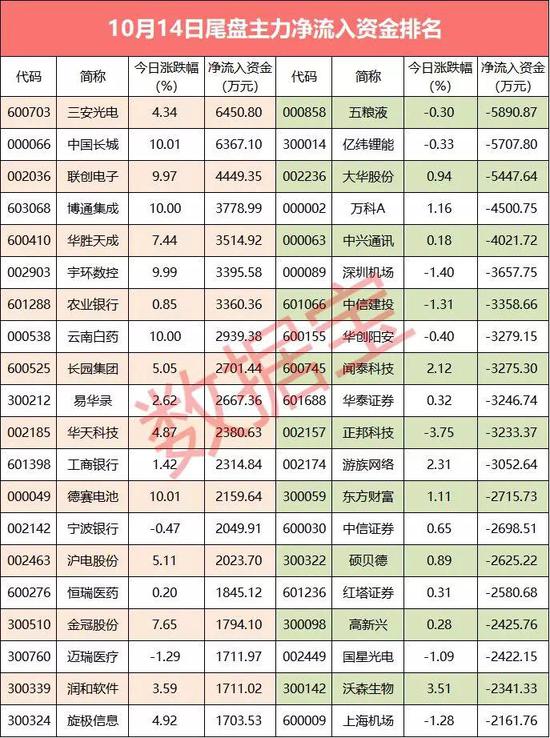 个股来看,有15只股票尾盘主力资金净流入超2000万元,近七成为科技股。电子股三安光电尾盘净流入资金最多,该股午后股价走高,收盘大涨逾4%,主力资金尾盘净流入6450万元。云计算概念股中国长城紧随其后,净流入6367万元,伴随着资金的流入中国长城午后股价从1%附近逐步走高,临近收盘封死涨停,盘后数据来看,龙虎榜资金净买入中国长城近3亿元,国泰君安证券上海江苏路、财通证券绍兴人民中路营业部等一线游资席位集体现身。