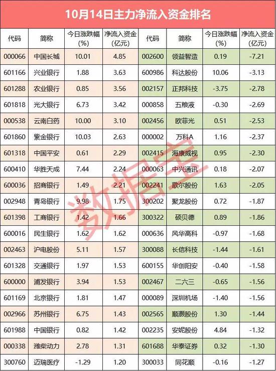 个股来看,共有29只个股主力资金净流入超亿元。中国长城主力资金净流入4.85亿元,净流入资金居首;兴业银行、农业银行紧随其后,全天净流入资金分别为3.63亿元、3.56亿元;全天净流入资金较多的还有光大银行、云南白药等。