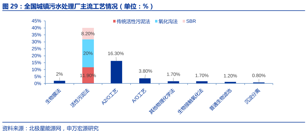 污水处理膜法占比提升:据全国投运城镇污水处理设施清单,采用较多的污水处理技术为氧化沟、A2/O、传统活性污泥法、SBR、A/O、生物膜法等,我国城镇污水处理技术仍以活性污泥法为主,生物膜法仅占比 2%。活性污泥法成本较低,但水处理效果较差,无法将污水处理厂排放水质提升至地表 III 类及以上,不能直接达到回用水标准,相较而言,膜法水处理技术虽然投资成本较高,但出水水质高、占地面积小、剩余污泥量较少,随国家对污水处理要求的提升,膜法水处理技术需求有望迎来持续增长。
