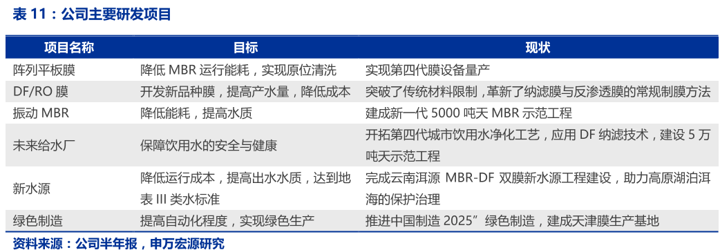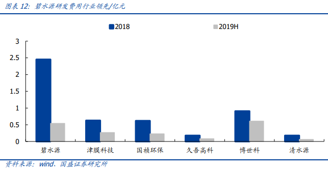 专注膜技术研发,技术水平国内一流:碧水源专注于膜技术的研发,主要集中在新型全系列膜材料的新产品开发与优化、生化工艺、整体解决方案、装备以及民品五大领域,公司处于行业领军地位。据公司 2019 年半年报披露,公司研发项目中,牵头承担国家级科研项目“新型膜法水处理环保装备绿色智能化设计制造平台建设”一个,合作承担国家级科研项目“再生水景观环境利用水质基准与风险控制技术”、“固态紫外光源系统集成技术与应用产品开发示范”、“石墨烯等碳基纳米材料 NQI 技术研究、集成与应用”三个,独自承担国家级科研项目“基于有机物高浓缩的膜法高品质再生水工艺技术研究与示范”一个。