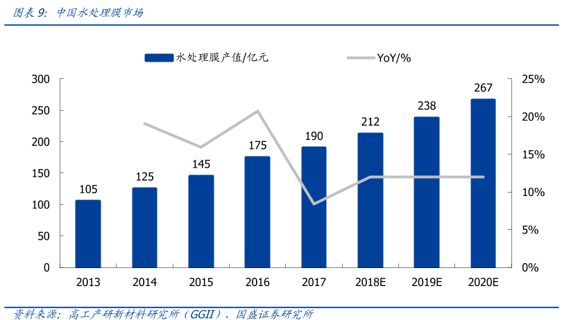 膜法水处理市场空间巨大:膜法水处理相对于传统水处理方式具有能耗低、工艺简洁、水质应用范围广和出水水质大幅提升等诸多优势,目前已用于污水处理(包括市政和工业领域)、水净化(包括市政和工业领域)、海水淡化和纯水制备等诸多领域。膜法水处理国内市场空间可观,预计 2020 年仅膜设备市场空间超过 267 亿元。高工产研新材料研究所(GGII)统计,2013-2017 年中国水处理膜设备产值复合增长率为18%。2017 年中国水处理膜及组件市场规模达 190 亿元,预计 2020 年超过 267 亿元,行业迎来高速发展期。