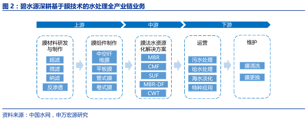 碧水源是中国污水资源化技术的开拓者和领先者,也是中国膜生物反应器(MBR)技术大规模应用的奠基者。公司主营业务为提供以膜法水处理为核心的整体技术和工程解决方案,一直以来,公司坚持以自主研发、国际先进的膜技术解决“水脏、水少、饮水安全”的水环境问题。目前公司是中国唯一一家集全系列膜材料研发、全系列膜与设备制造、膜技术工艺应用于一体的企业,现已发展为全球最全的膜产品生产商之一和先进的环保设备制造商之一。