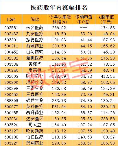 从单只股票来看,不含今年上市的新股,25只医药股年内累计涨幅翻倍,其中英科医疗、硕世生物、未名医药、奥翔药业、西藏药业位居涨幅榜前五位。涨幅最高的是英科医疗,年内累计上涨531.64%,同时暂夺A股涨幅榜冠军(不含今年上市的新股)。
