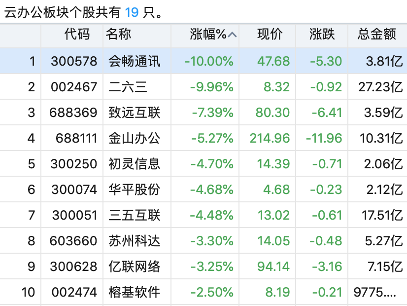 会畅通讯的跌停也带动云办公板块持续降温。此前连续4板的二六三今日跌停,致远互联连跌3日,今日大跌7.4%;科创板金山办公继续跌5.3%。