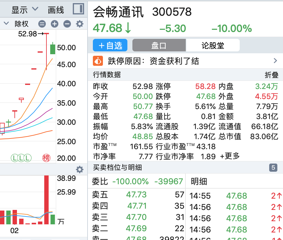 2月11日讯,云办公大牛股会畅通讯自年后开市以来,连续6个涨停,昨日早盘涨停突现炸板,一度触及跌停板,后收盘依旧涨停。但今日盘初即封死跌停,直到收盘,现报价47.68元,成交额3.8亿。