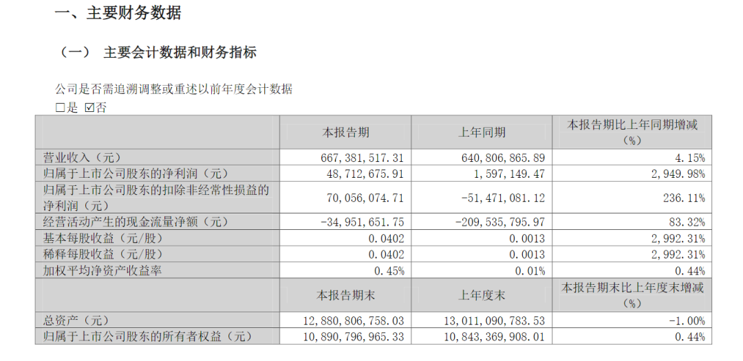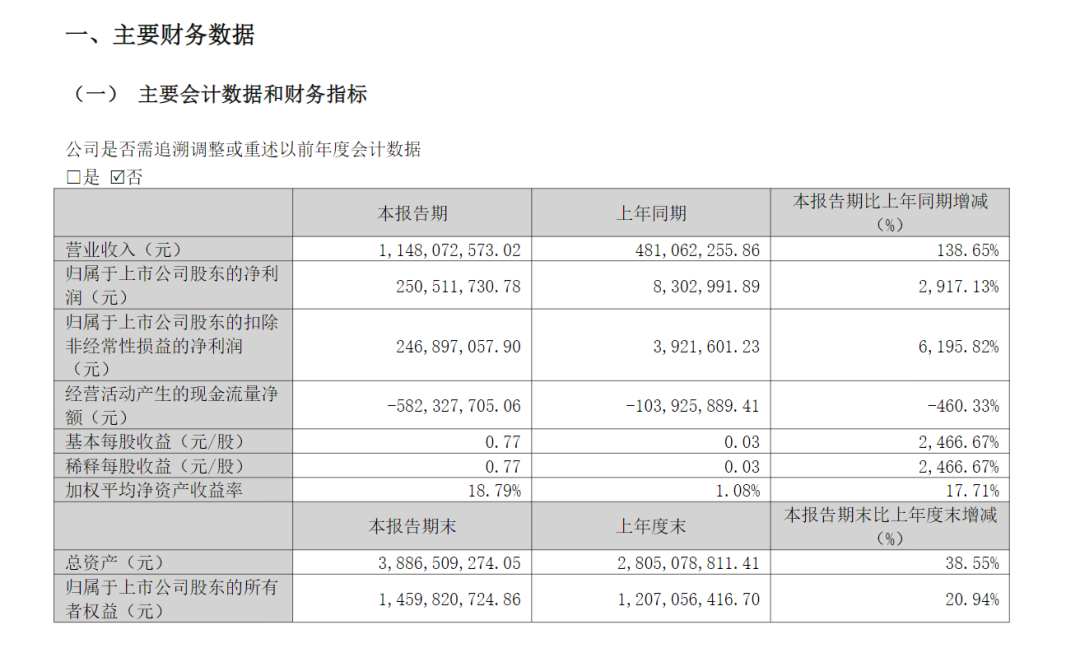 翔鹭钨业2026年第一季度实现营业收入11.48亿元,同比增长138.65%;归属于上市公司股东的净利润为2.51亿元,同比增长2917.13%;扣非归母净利润2.47亿元,同比增长6195.82%,业绩变动主要系钨价上涨导致收入增加。