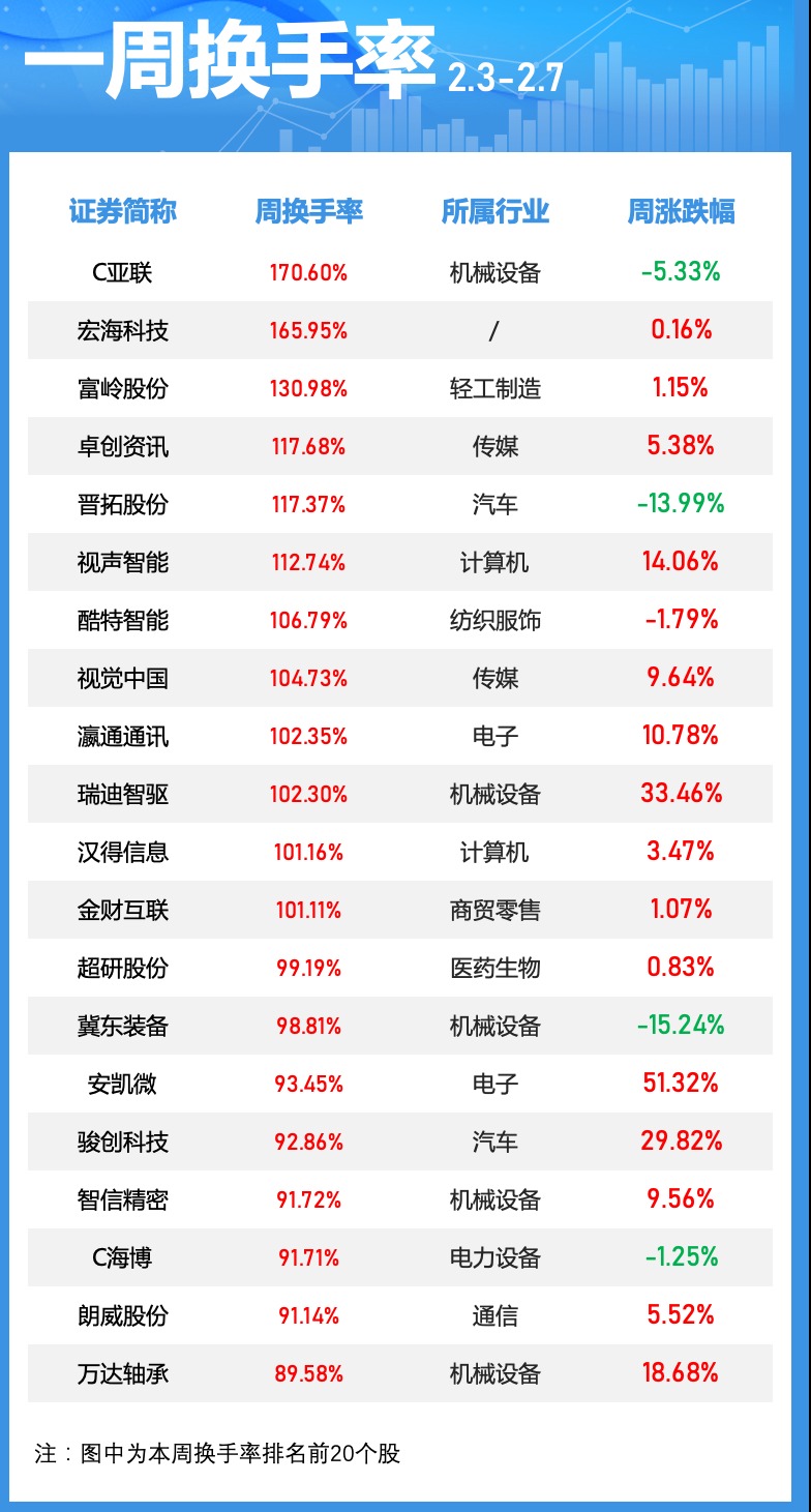 本周仅有12只个股换手率超过100%。其中,C亚联排名居首,周换手率达到170.60%;此外,宏海科技、富岭股份、卓创资讯本周换手率居前。