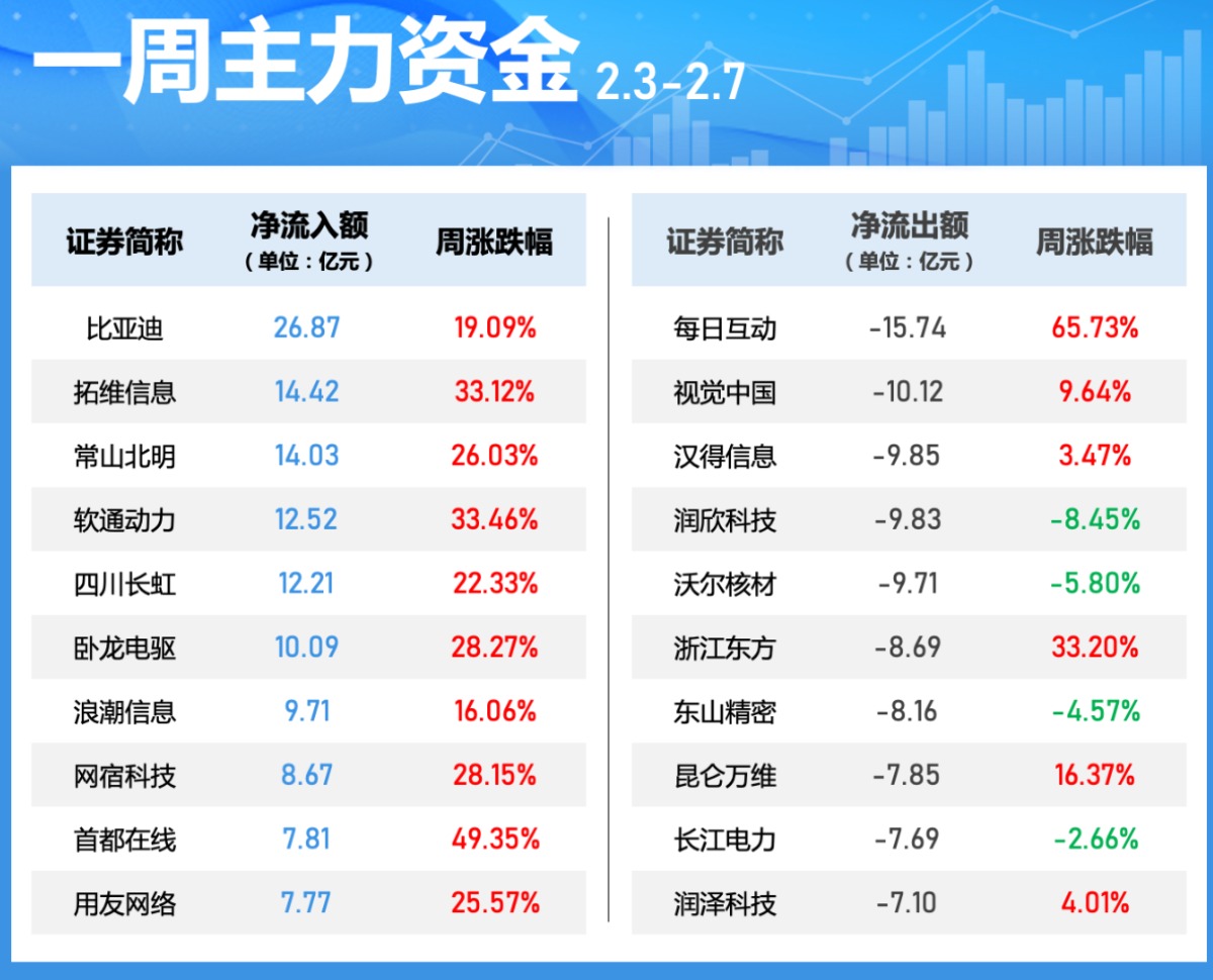 一周个股动向:DeepSeek概念股大涨 比亚迪获主力资金青睐