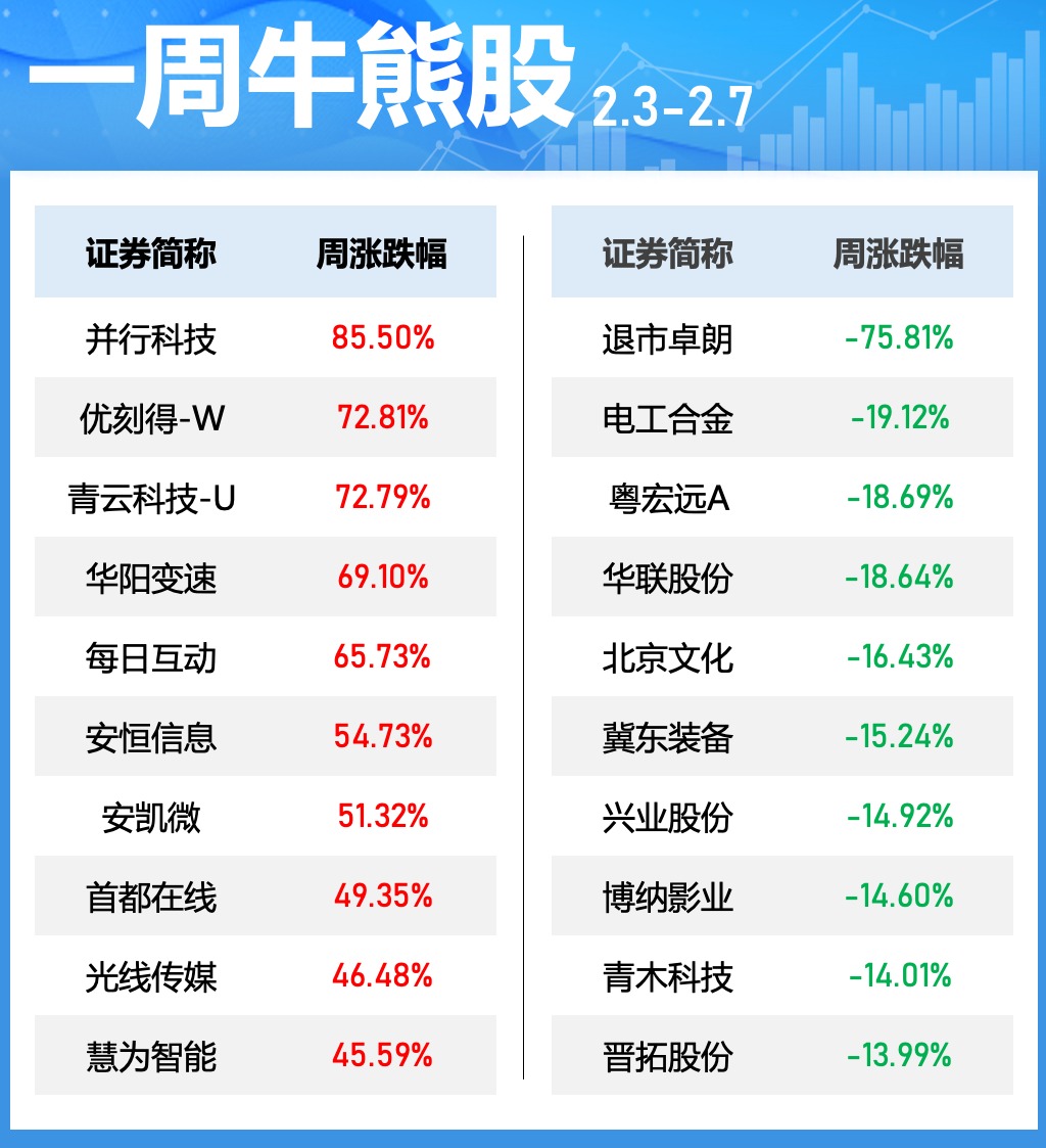本周三个交易日中,共有43只个股涨幅超30%。本周DeepSeek概念股表现活跃,其中,并行科技、优刻得、青云科技周涨幅均超70%。值得注意的是,并行科技此前提示,尚未就算力服务与深度求索建立业务合作关系。