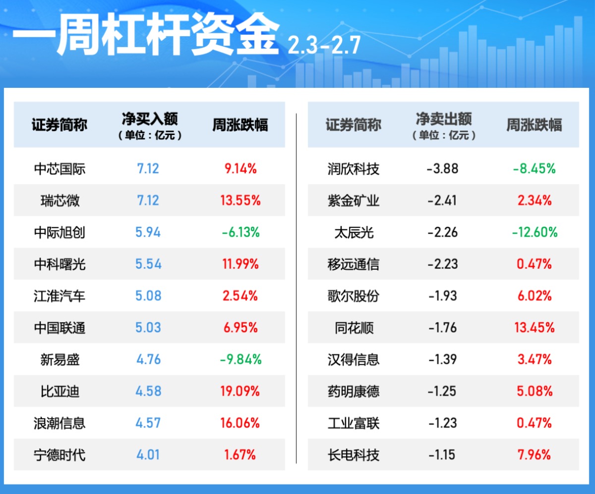 中芯国际本周获融资净买入居首,净买入额为7.12亿元。瑞芯微、中际旭创、中科曙光净买入居前,金额分别为7.12亿元、5.94亿元、5.54亿元;润欣科技、紫金矿业、太辰光遭净卖出额居前,金额分别为3.88亿元、2.41亿元、2.26亿元。