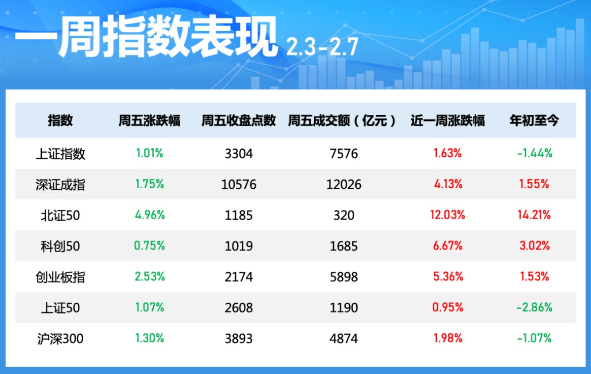 本周(2月3日至7日)的三个交易日中,市场主要指数多数上涨。上证指数累计涨1.63%,深成指涨4.13%,创业板指涨5.36%。本周市场赚钱效应较好,日均成交量较年前显著增长,其中2月7日沪深两市的成交额近2万亿元。板块概念方面,本周DeepSeek概念股热度持续,机器人、IT服务、半导体板块走势活跃。