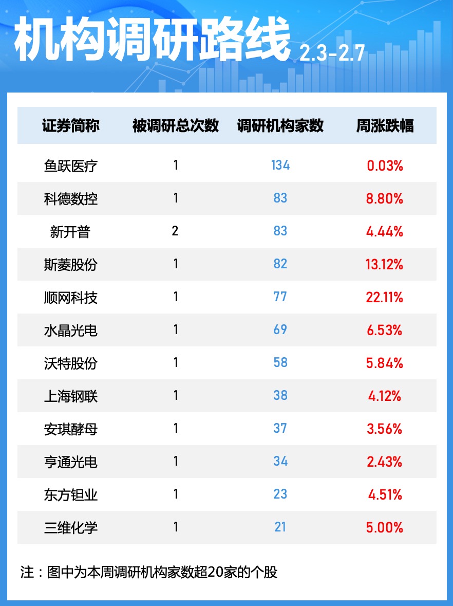 机构本周共调研了32家上市公司,其中鱼跃医疗最获关注,参与调研的机构达134家。此外,科德数控、新开普等均获超80家机构调研。