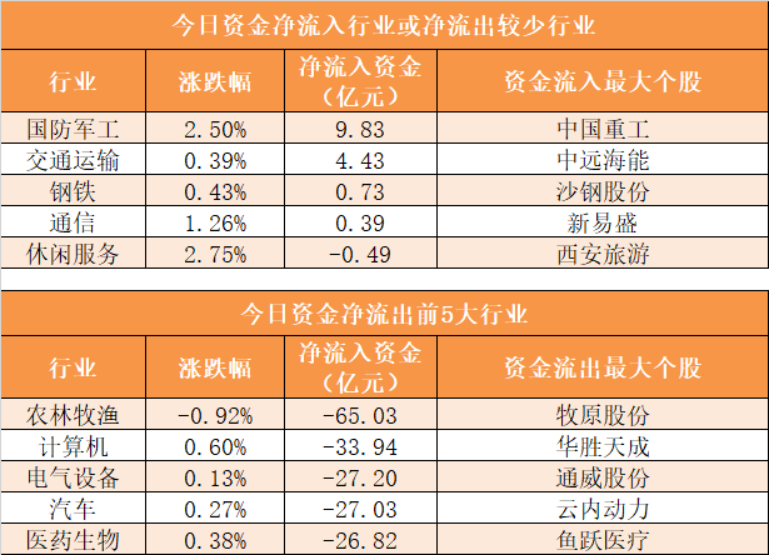 国防军工行业净流入9.83亿元居首