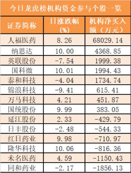 盘后龙虎榜数据显示,机构现身14股,其中人福医药等8股呈现机构资金净买入,同和药业等6股呈现机构资金净卖出。