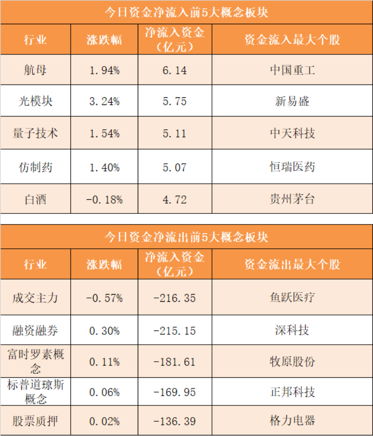 概念板块方面,今日航母、光模块、量子技术、仿制药等概念板块资金呈现净流入,其中航母概念净流入6.14亿元居首。
