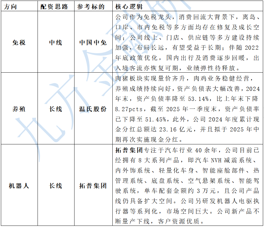 随着美国关税政策的影响边际递减,投资者风险偏好逐渐回升。同时,我国将实施更加积极有为的宏观政策,用好用足更加积极的财政政策和适度宽松的货币政策,“以高质量发展的确定性应对外部环境急剧变化的不确定性”,有望带动盈利稳中有升。当前估值处于历史中低水平,中长期来看,性价比较高。配置方面,短期内建议关注:受益于扩大内需政策的消费板块;自主可控程度提升的科技板块;贸易依赖度较低以及股息率较高的板块,以及业绩披露正反馈的公司。