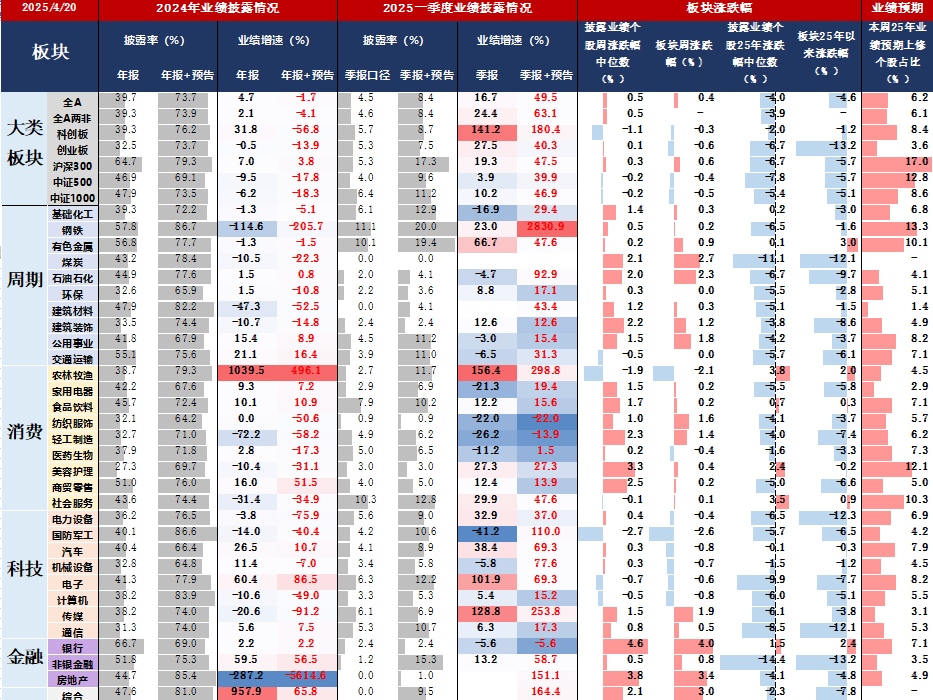 所以在当下的估值较低的阶段,我们关注4月来业绩超预期的方向,4月决断超预期的方向,有望在5月成为资金继续追逐的方向,截止到4月20日,从已经披露的情况来看,消费板块的农林牧渔/商贸延续增长趋势,科技成长复苏,传媒、军工、机械、电子大幅增长,周期资源行业有所回暖,钢铁、石化、有色增速居前。、科技的电子、金融中非银业绩增长较快,周期行业中交运/工业业绩占优。