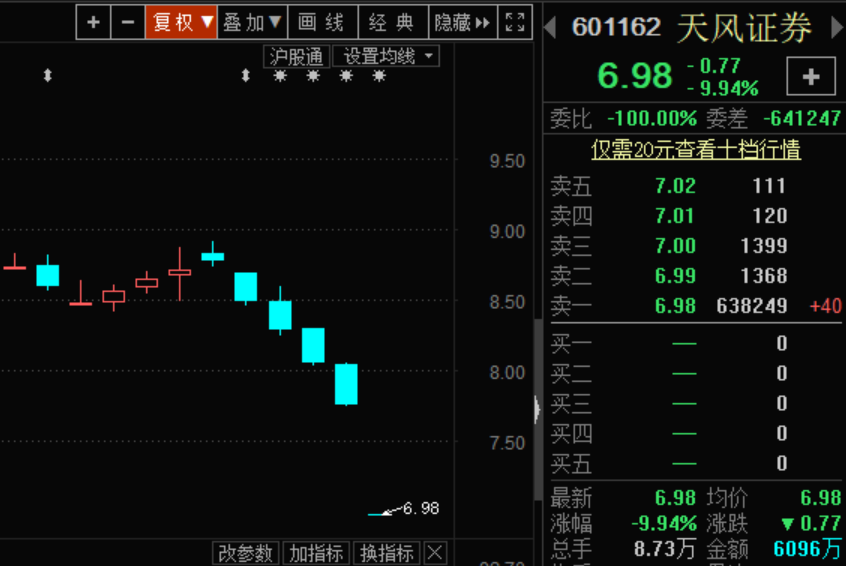 第二,解禁股的大量上市。如天风证券今日有18.35亿股首发限售股解禁,以最新价6.98元计算,解禁市值逾128亿元。今日天风证券开盘一字跌停,领跌券商板块,股价创半年多来新低。