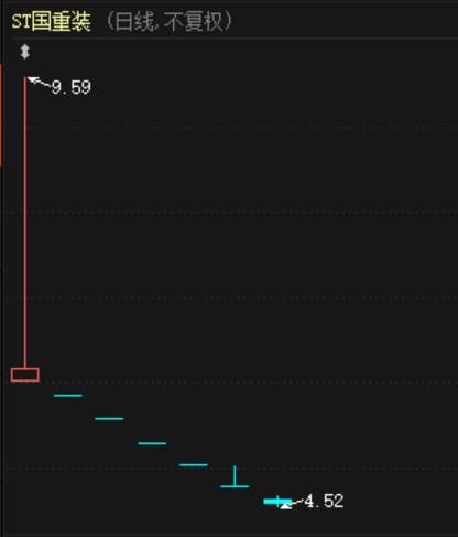 以为“满血复活”的ST国重装(601399),上市首日大涨85%,10亿资金追高入场后,随即遭遇6个跌停,股价已遭腰斩。