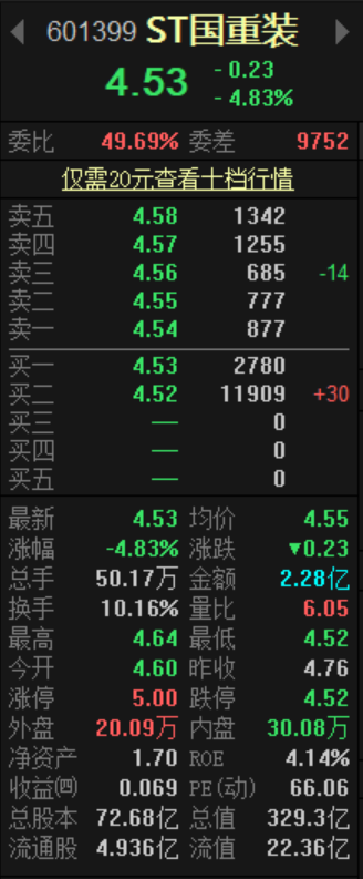 6月16日早盘,ST国重装盘中再度跌停,这已经是第六个跌停;不过临近中午收盘,跌停板被打开,但也只打开了两个价位。如果按照6月8日恢复上市当日最高价9.59元计算,7个交易日ST国重装市值已蒸发368亿元,股价下跌近53%。