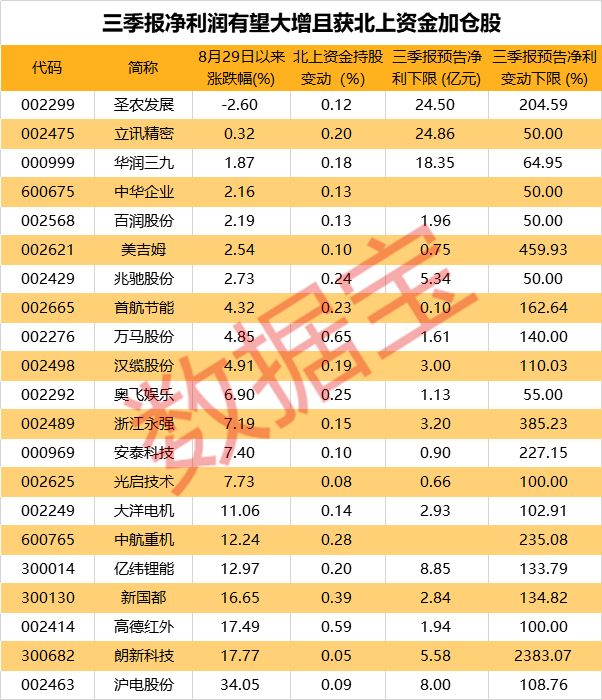 结合业绩来看,21股最新持股较8月28日增加的同时,三季报有望盈利,且净利润增幅下限超50%。具体来看,朗新科技获北上资金小幅加仓,三季报预计净利润下限5.58亿元,同比增长超23倍,位居首位。美吉姆、浙江永强、中航重机、安泰科技等5股持续比例均增加0.1个百分点以上,且三季报净利润增幅下限均超过2倍。